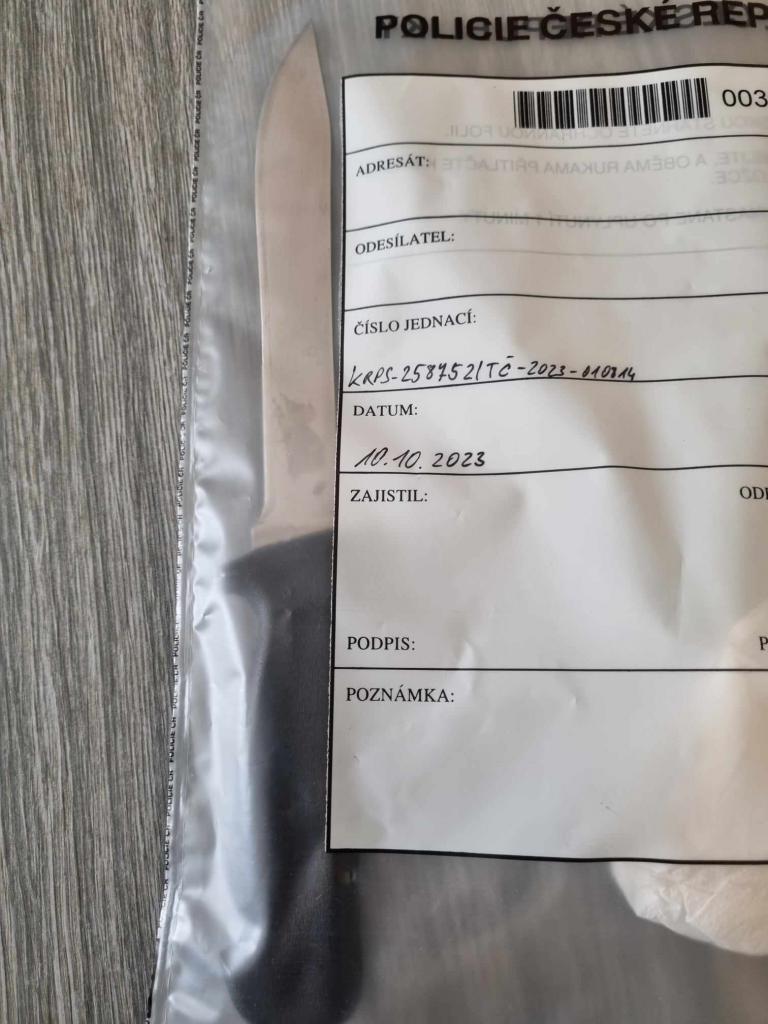 nůž o délce 30 cm s černou plastovou rukojetí o délce 12cm, nalezen před domem ev. č. 159 v ul. Na Zámku v Sadské